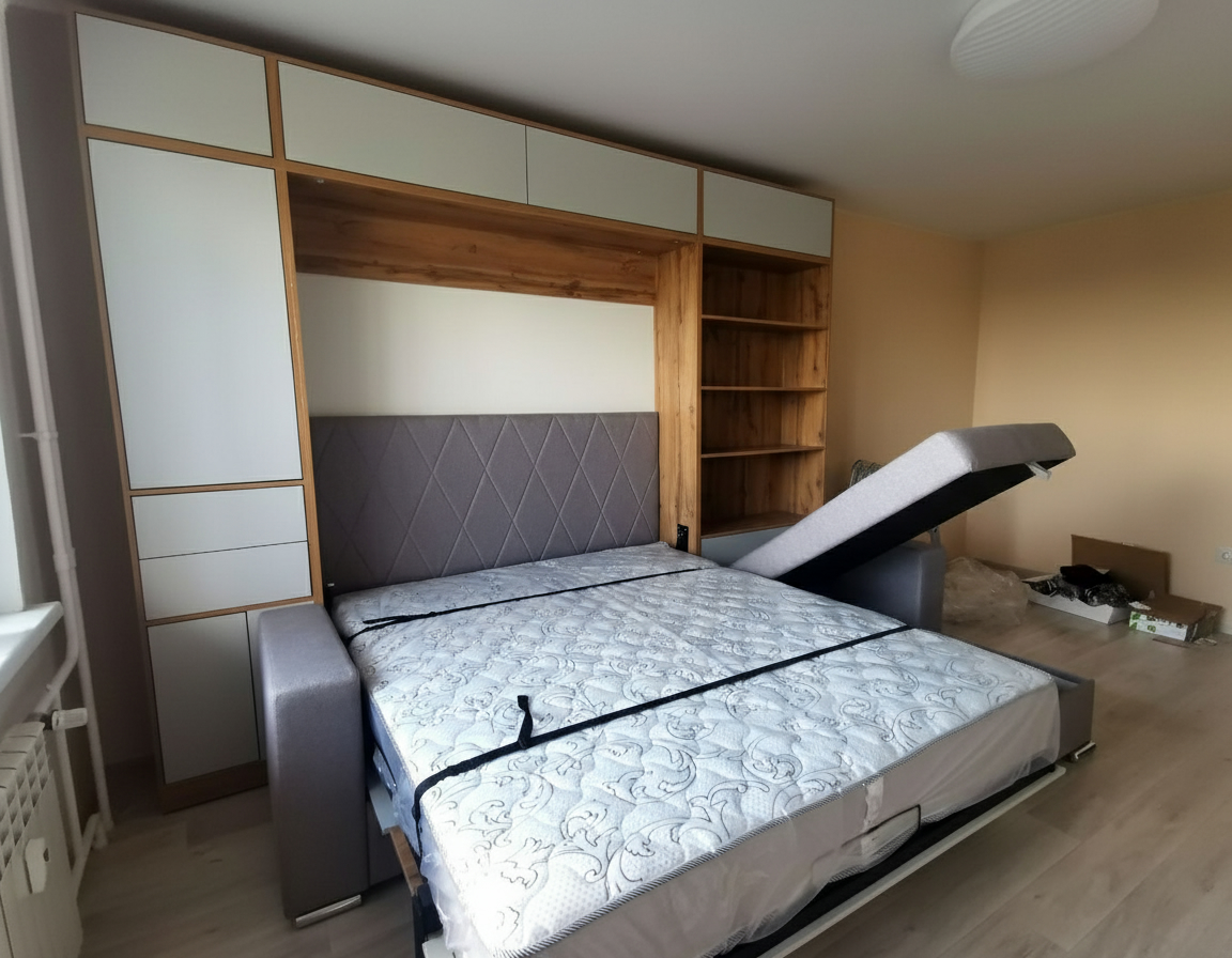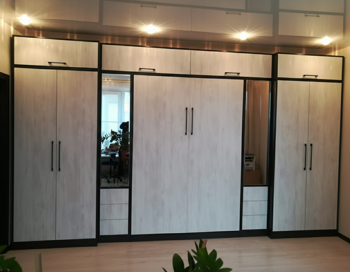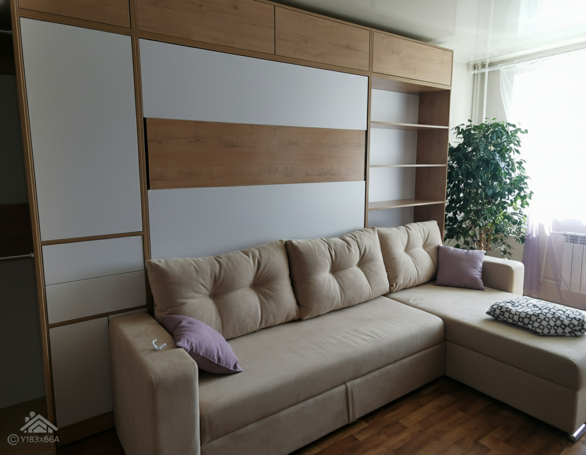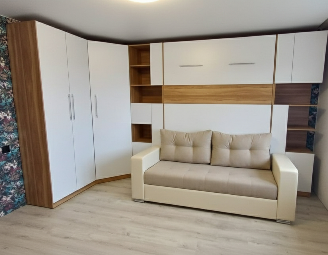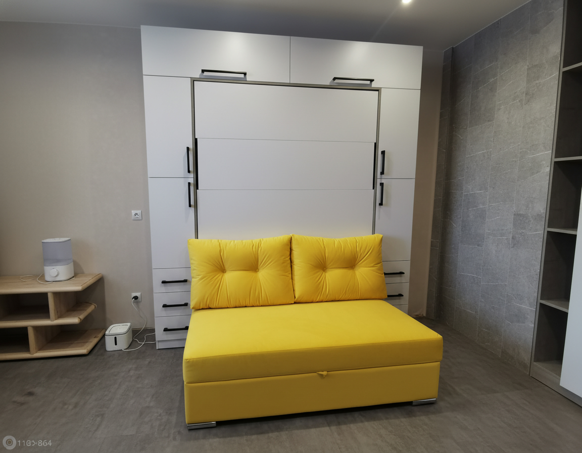 - Шкаф-кровать с диваном предоставляет удобство использования двух предметов мебели в одном. Это особенно полезно для помещений с ограниченным пространством, так как она позволяет максимально эффективно использовать доступное пространство.
