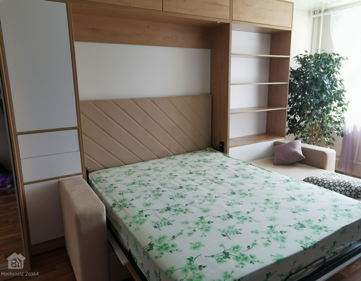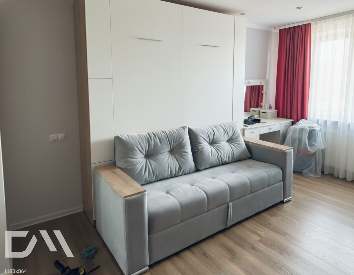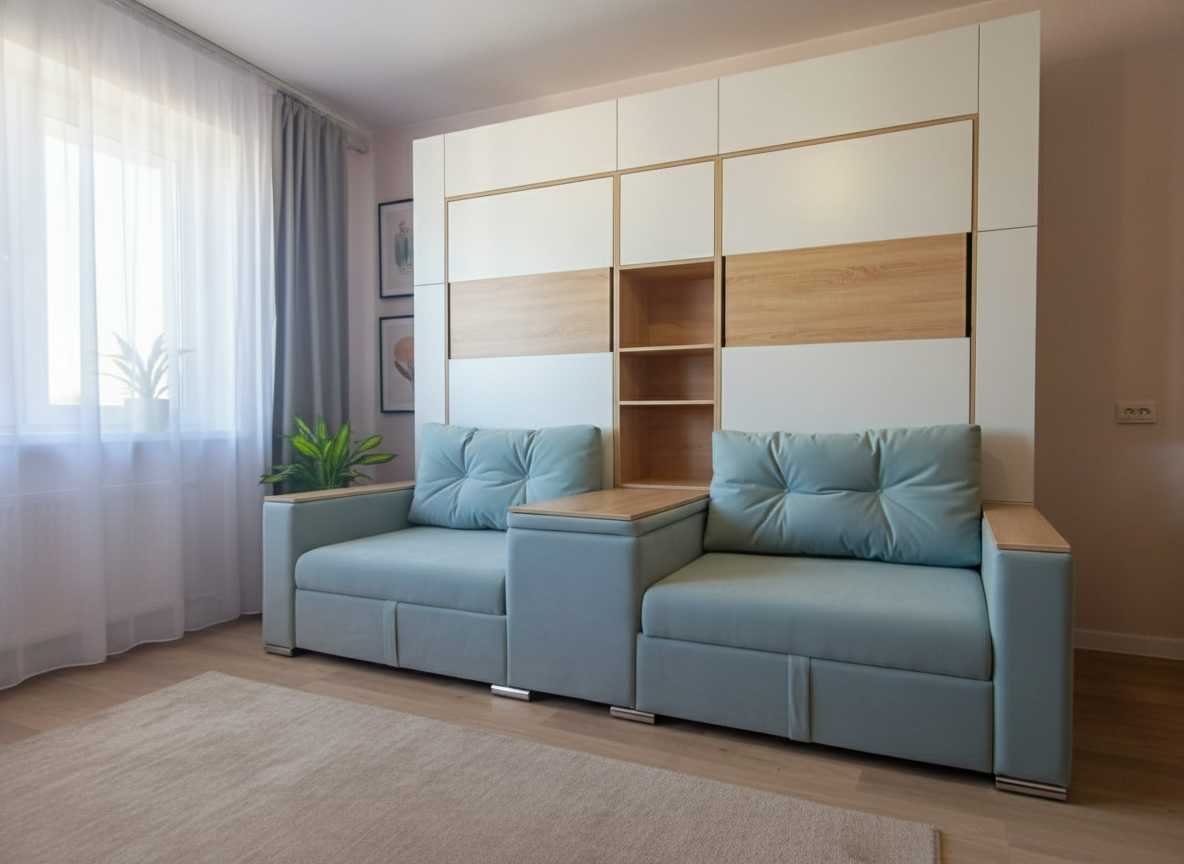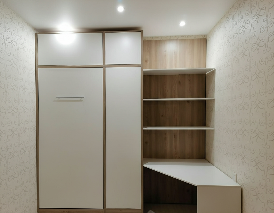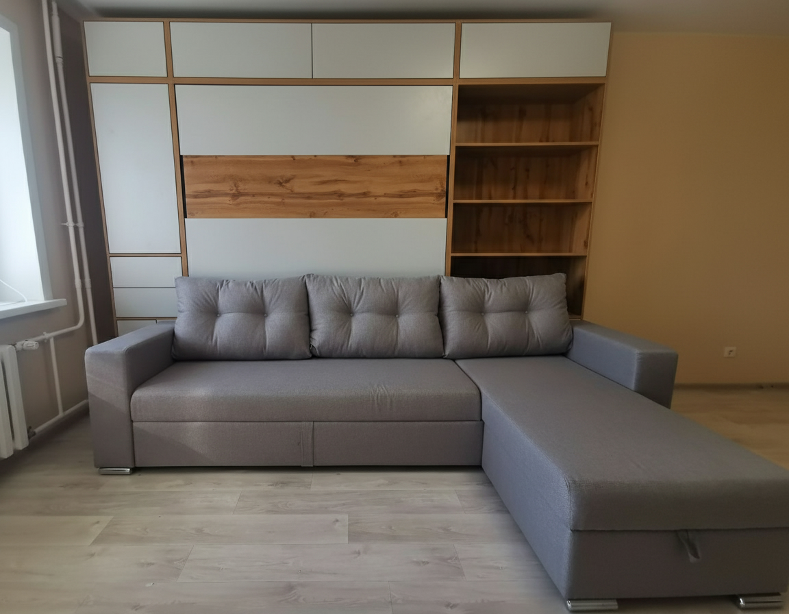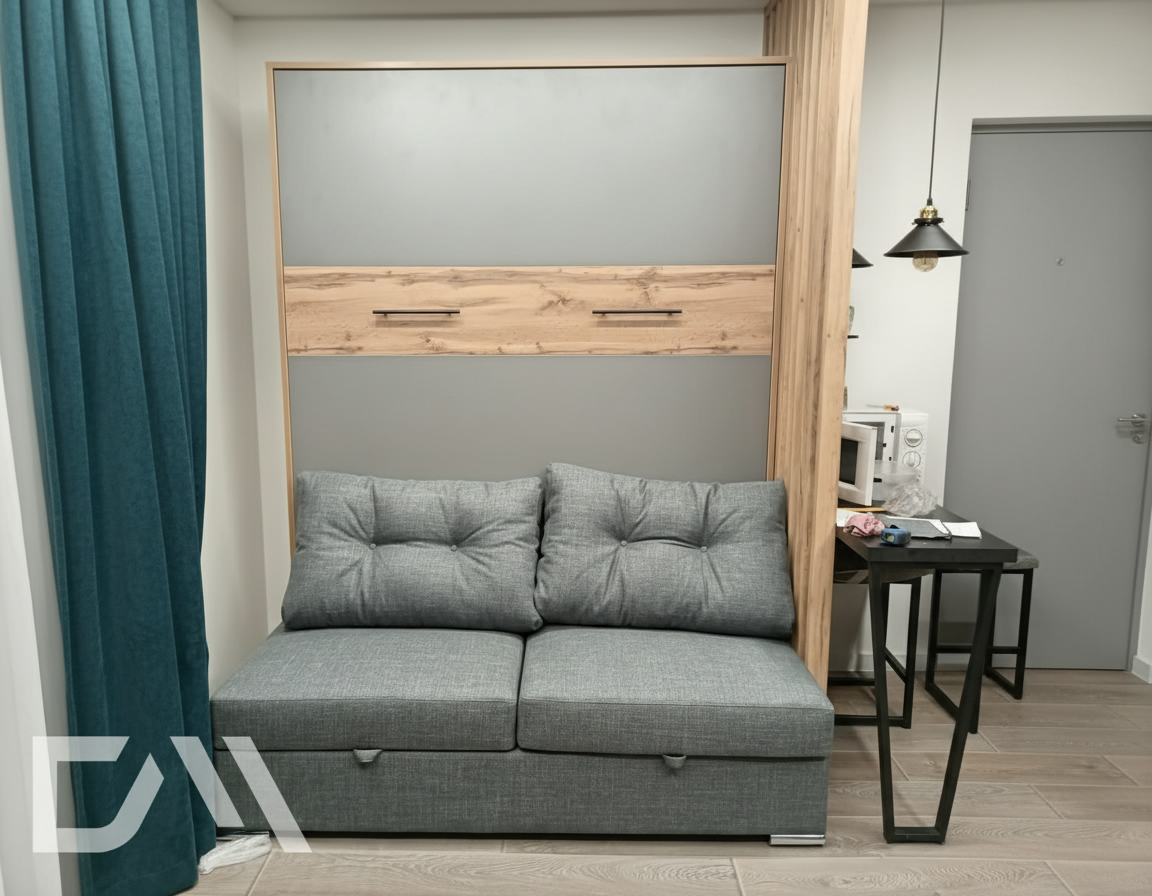 - Шкаф-кровать с диваном предоставляет удобство использования двух предметов мебели в одном. Это особенно полезно для помещений с ограниченным пространством, так как она позволяет максимально эффективно использовать доступное пространство.