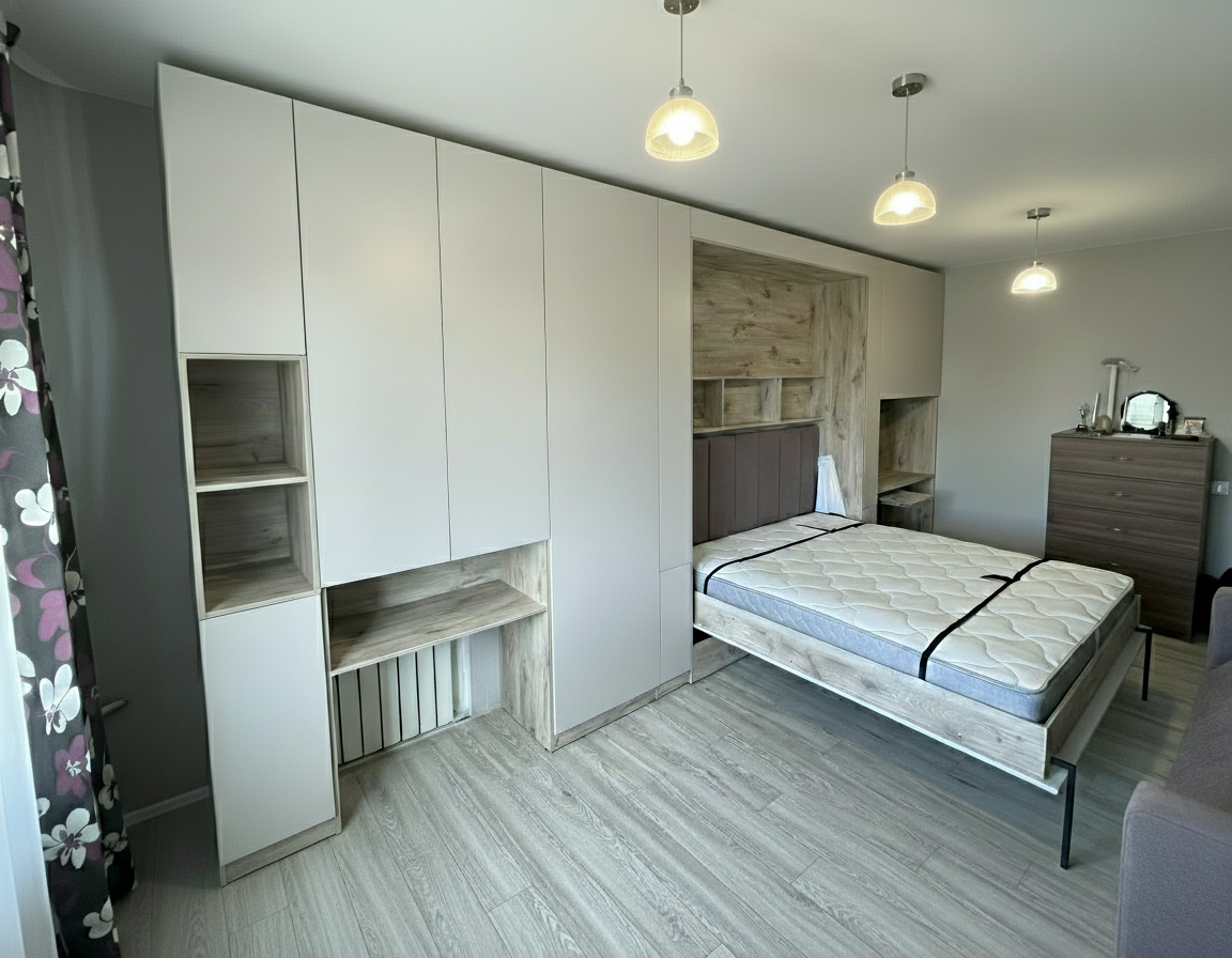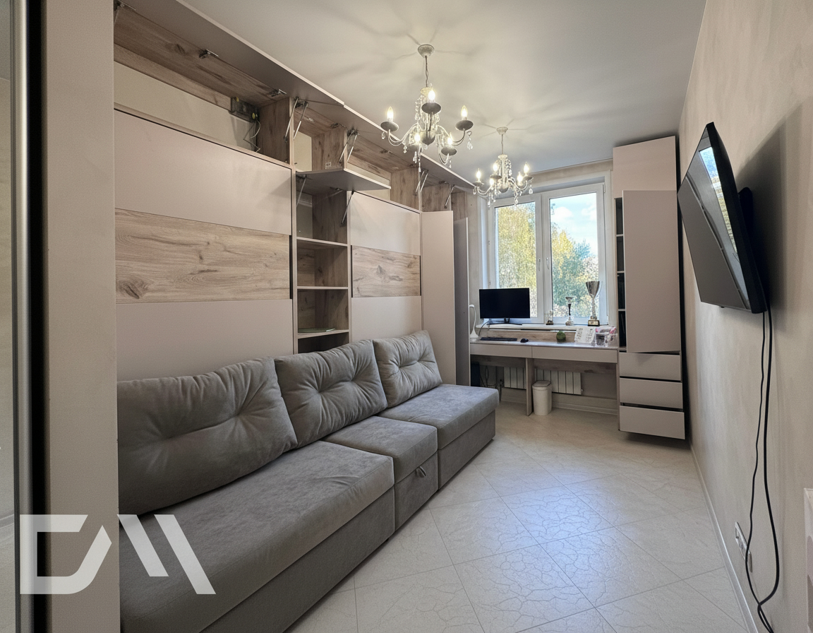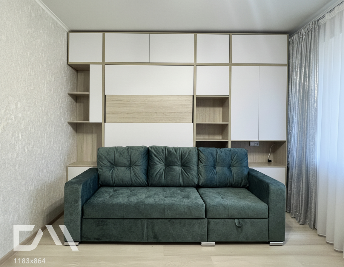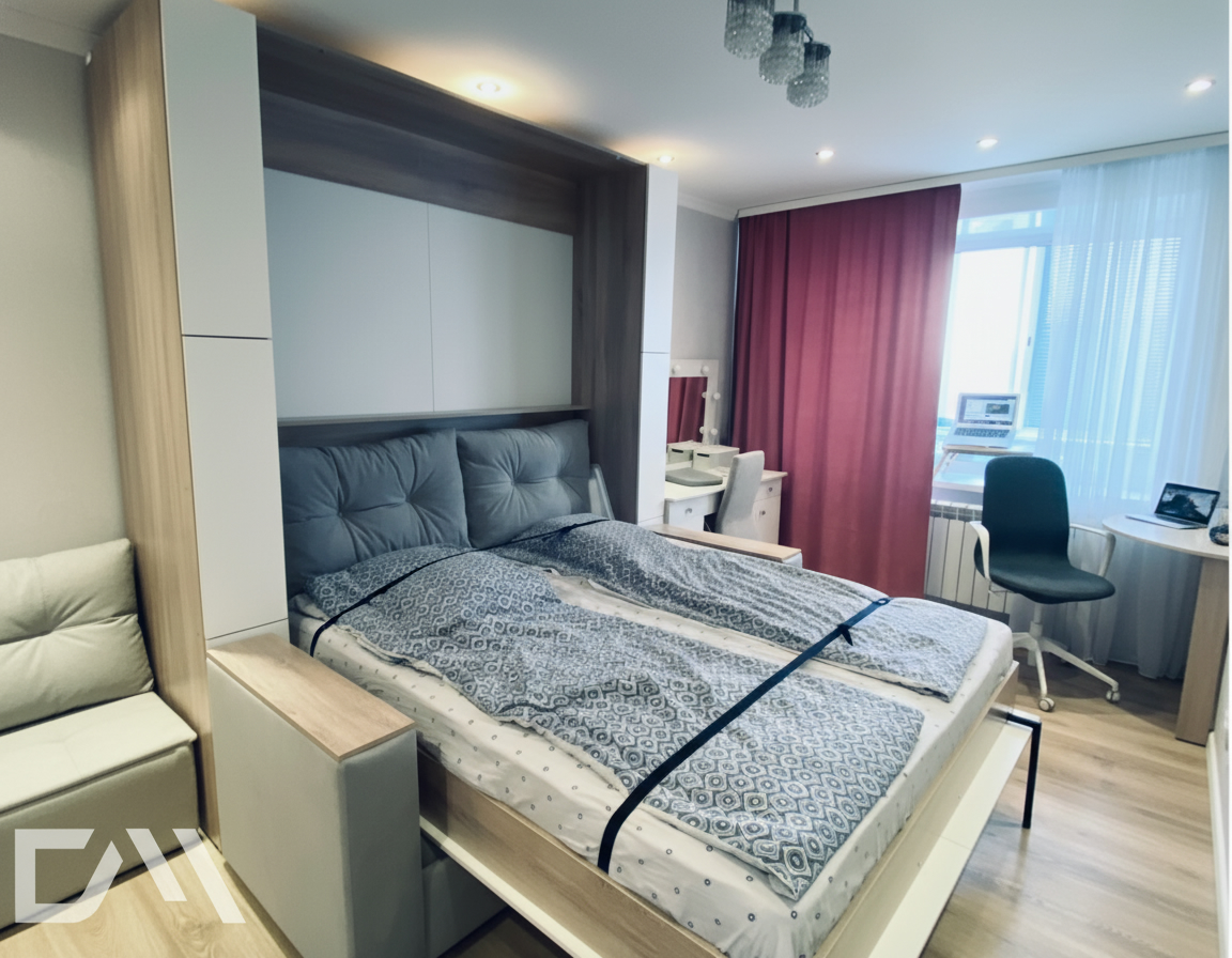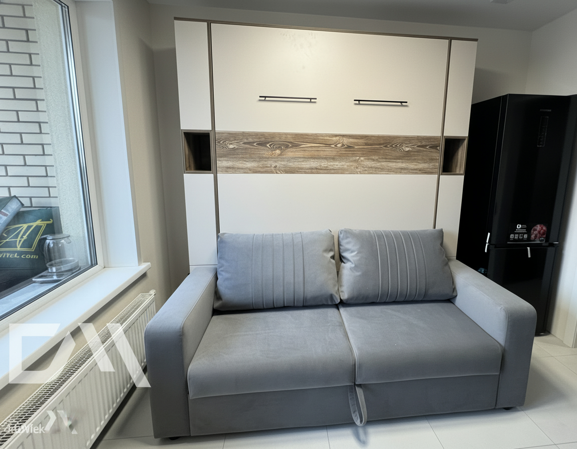 - Шкаф-кровать с диваном предоставляет удобство использования двух предметов мебели в одном. Это особенно полезно для помещений с ограниченным пространством, так как она позволяет максимально эффективно использовать доступное пространство.