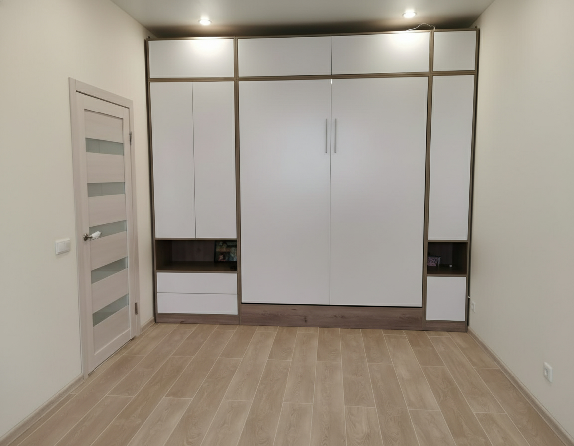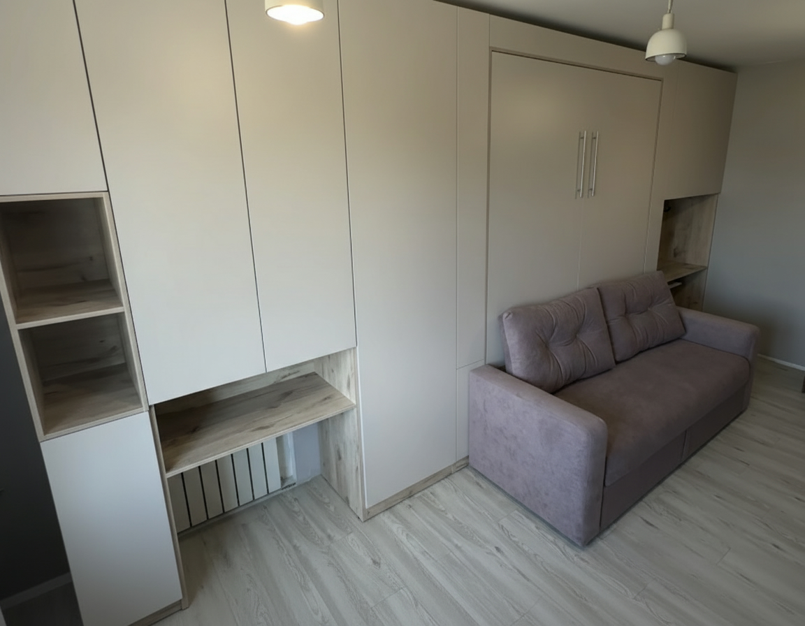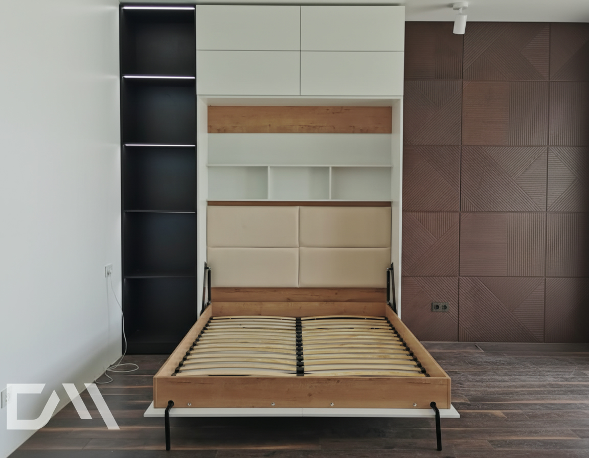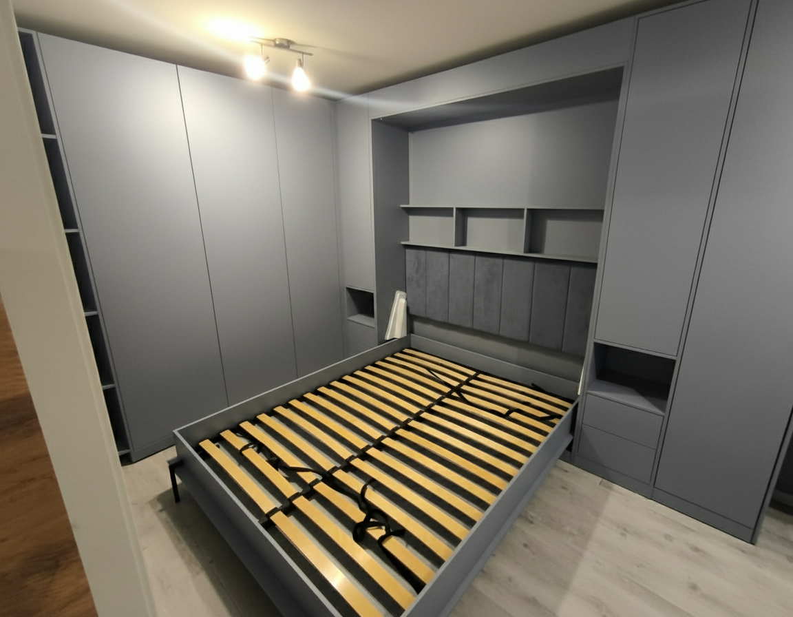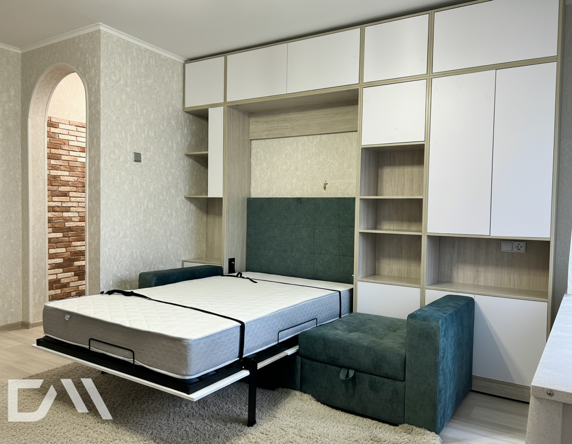 - Шкаф-кровать с диваном предоставляет удобство использования двух предметов мебели в одном. Это особенно полезно для помещений с ограниченным пространством, так как она позволяет максимально эффективно использовать доступное пространство.