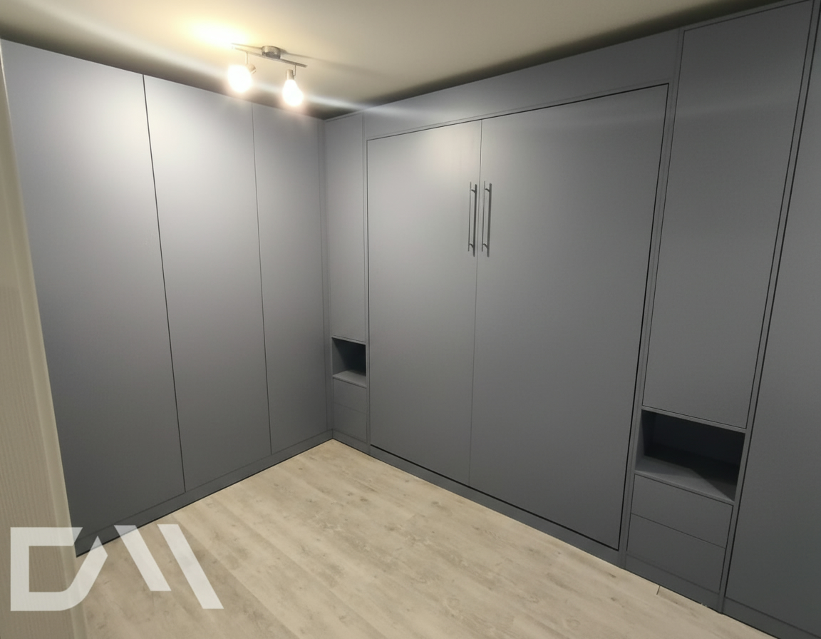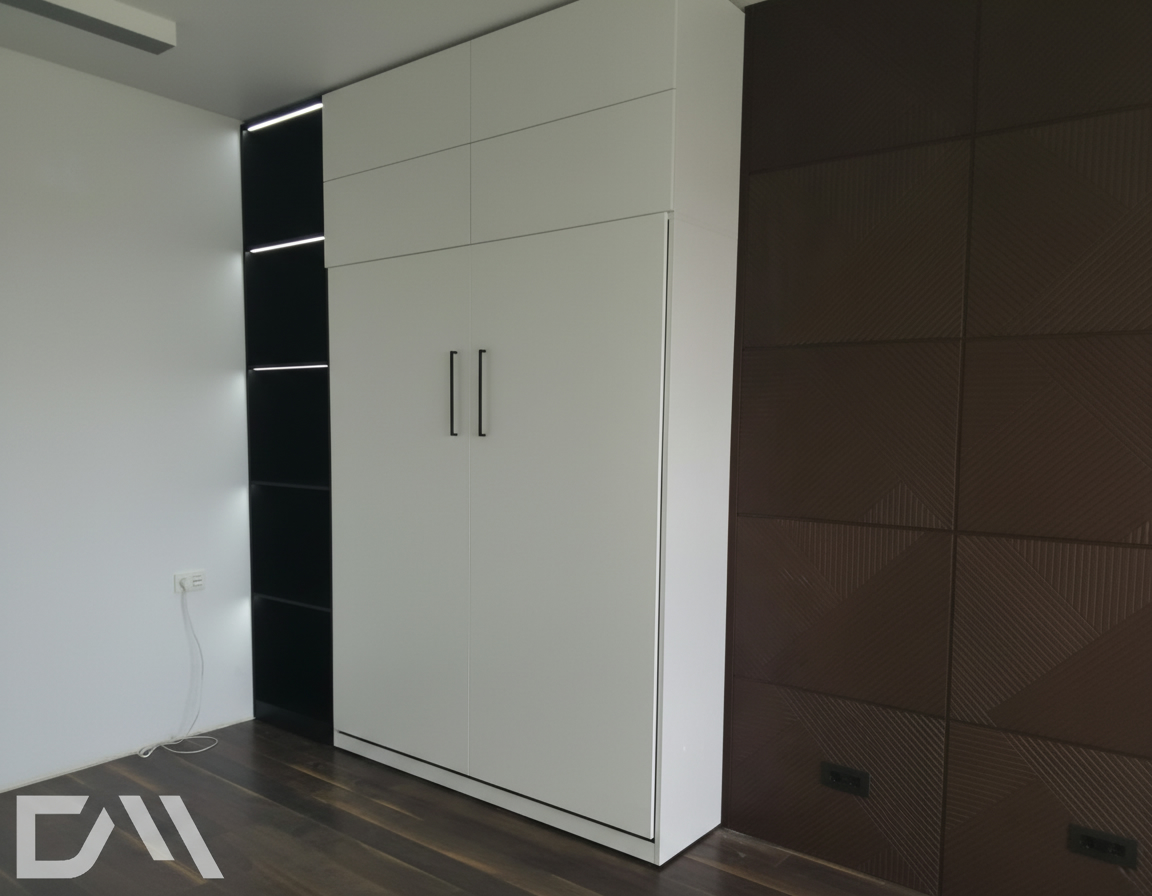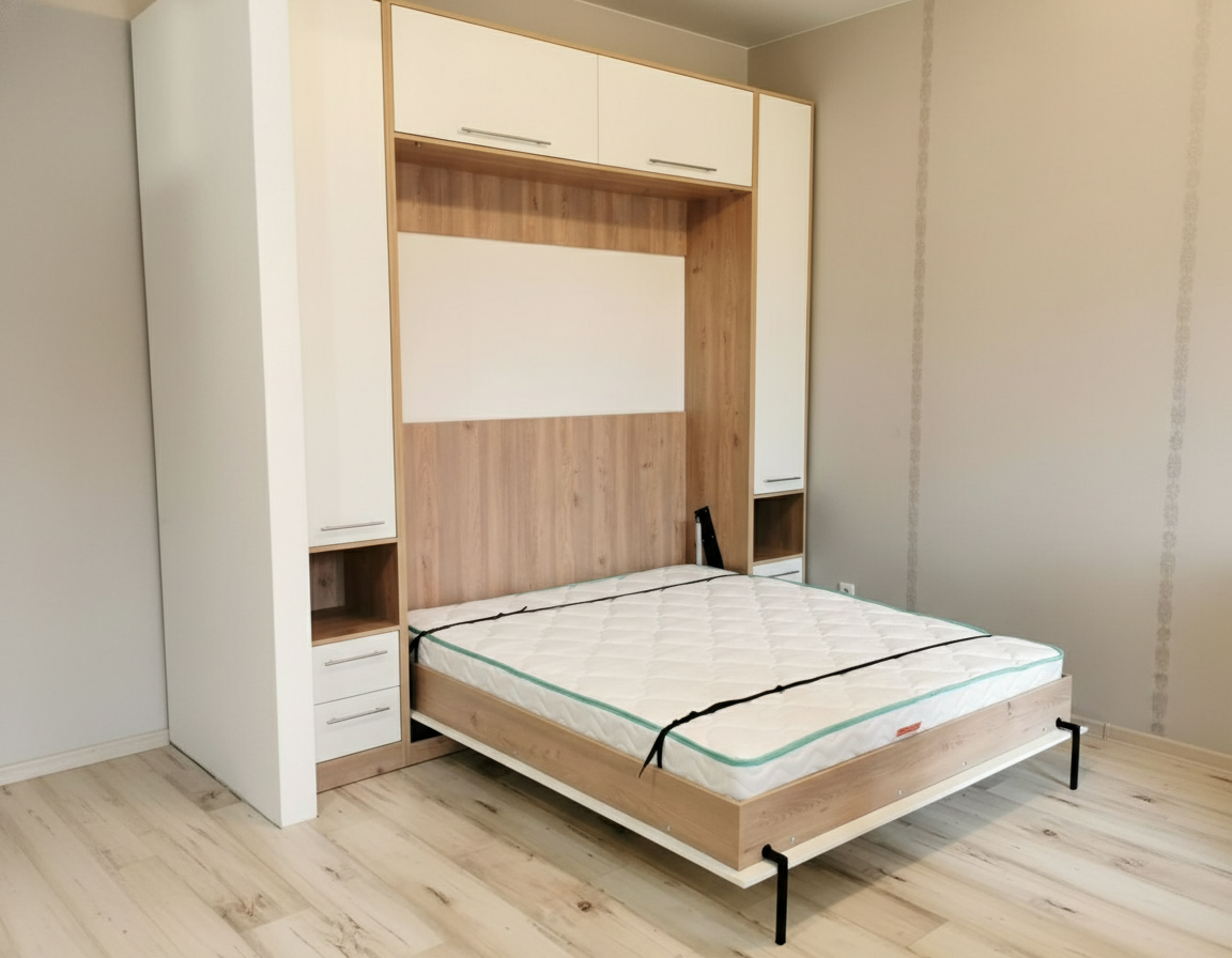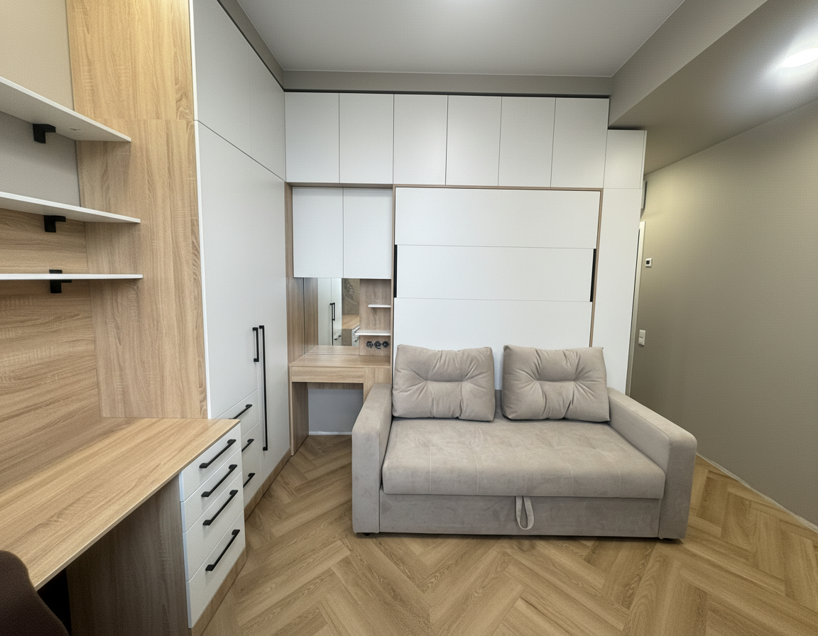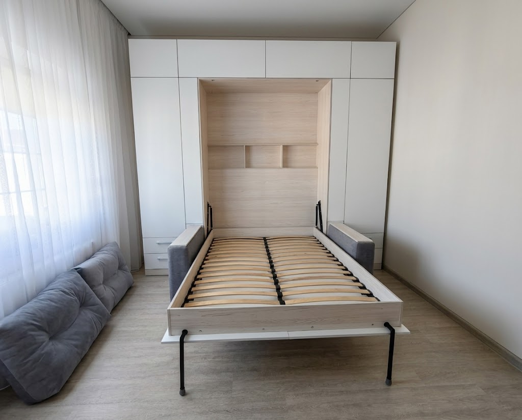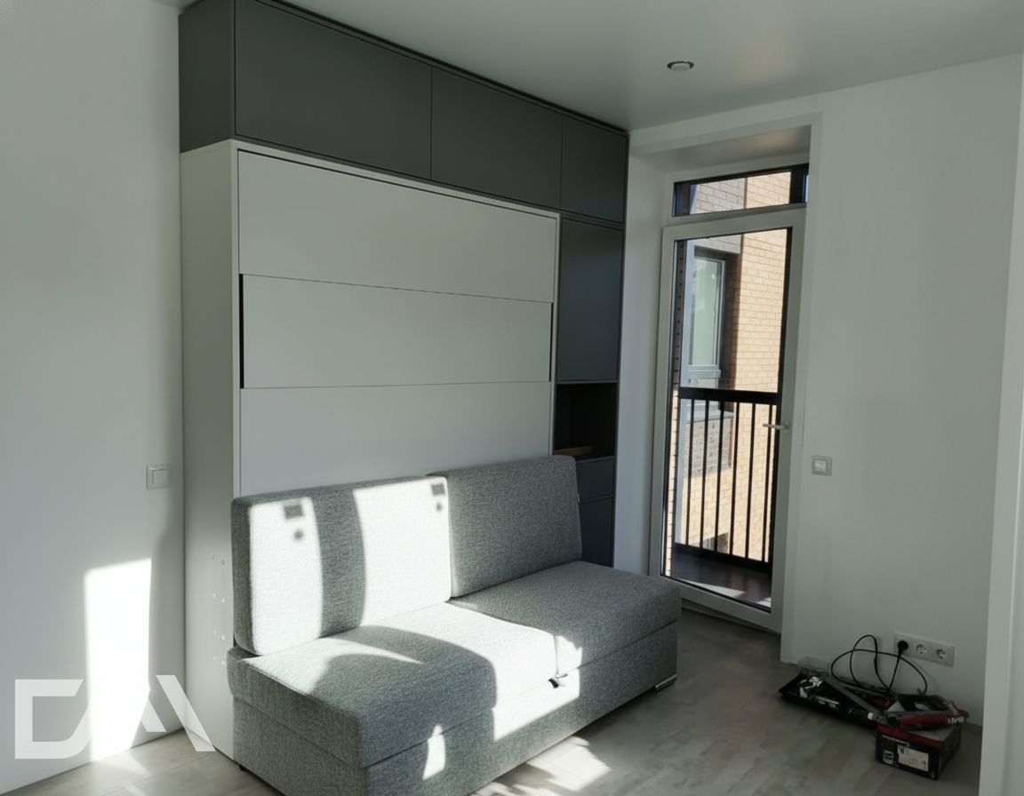 - Шкаф-кровать с диваном предоставляет удобство использования двух предметов мебели в одном. Это особенно полезно для помещений с ограниченным пространством, так как она позволяет максимально эффективно использовать доступное пространство.